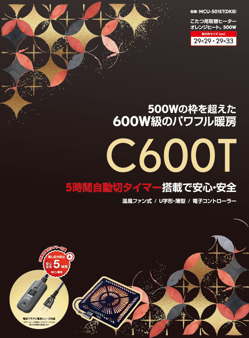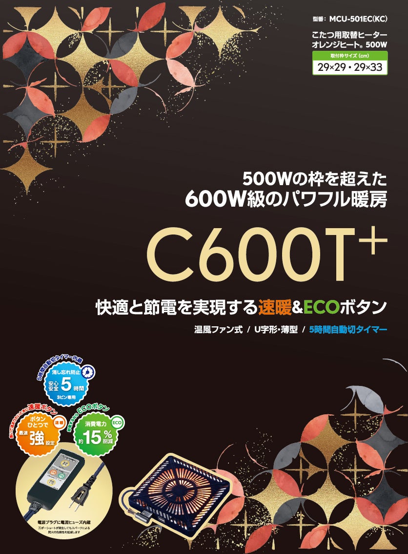 独自の高効率ヒーター「オレンジヒート®」を搭載。C600T+、C600Tは500Wながら600W級のパワフルな暖房を実現。省エネと快適性を両立が実感できます。
