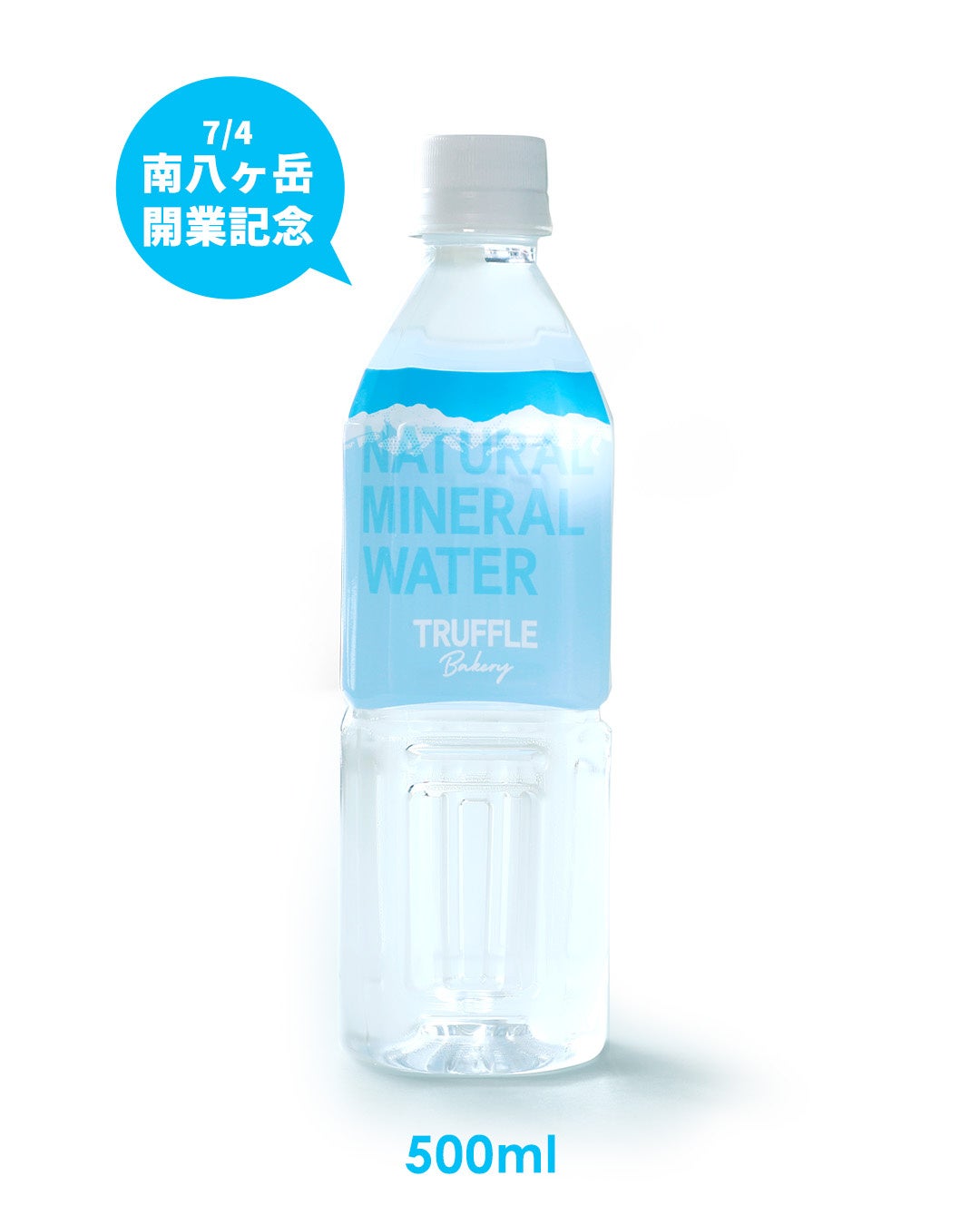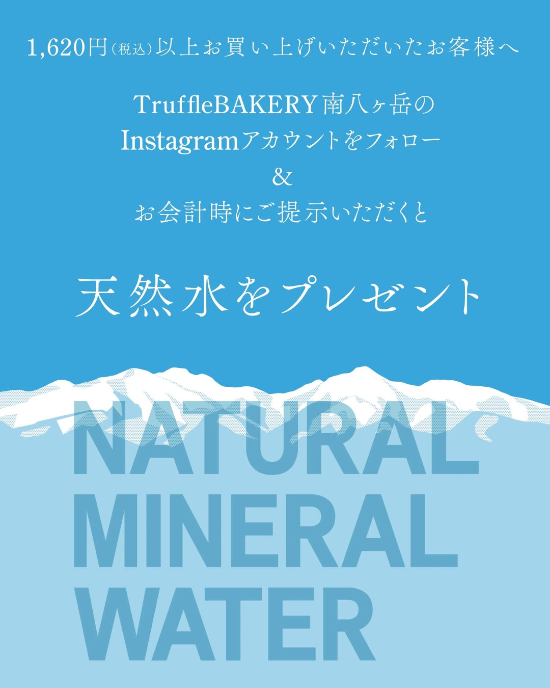 TruffleBAKERY南八ヶ岳の開業向けて、1会計1,620円(税込)以上ご購入いただき、「TruffleBAKERY 南八ヶ岳」のInstagramをフォローいただいたお客様に天然水をプレゼントします。この天然水ボトルのデザインは南八ヶ岳の山並みを模したオリジナルデザインで、今後TruffleBAKERYにて販売予定です。