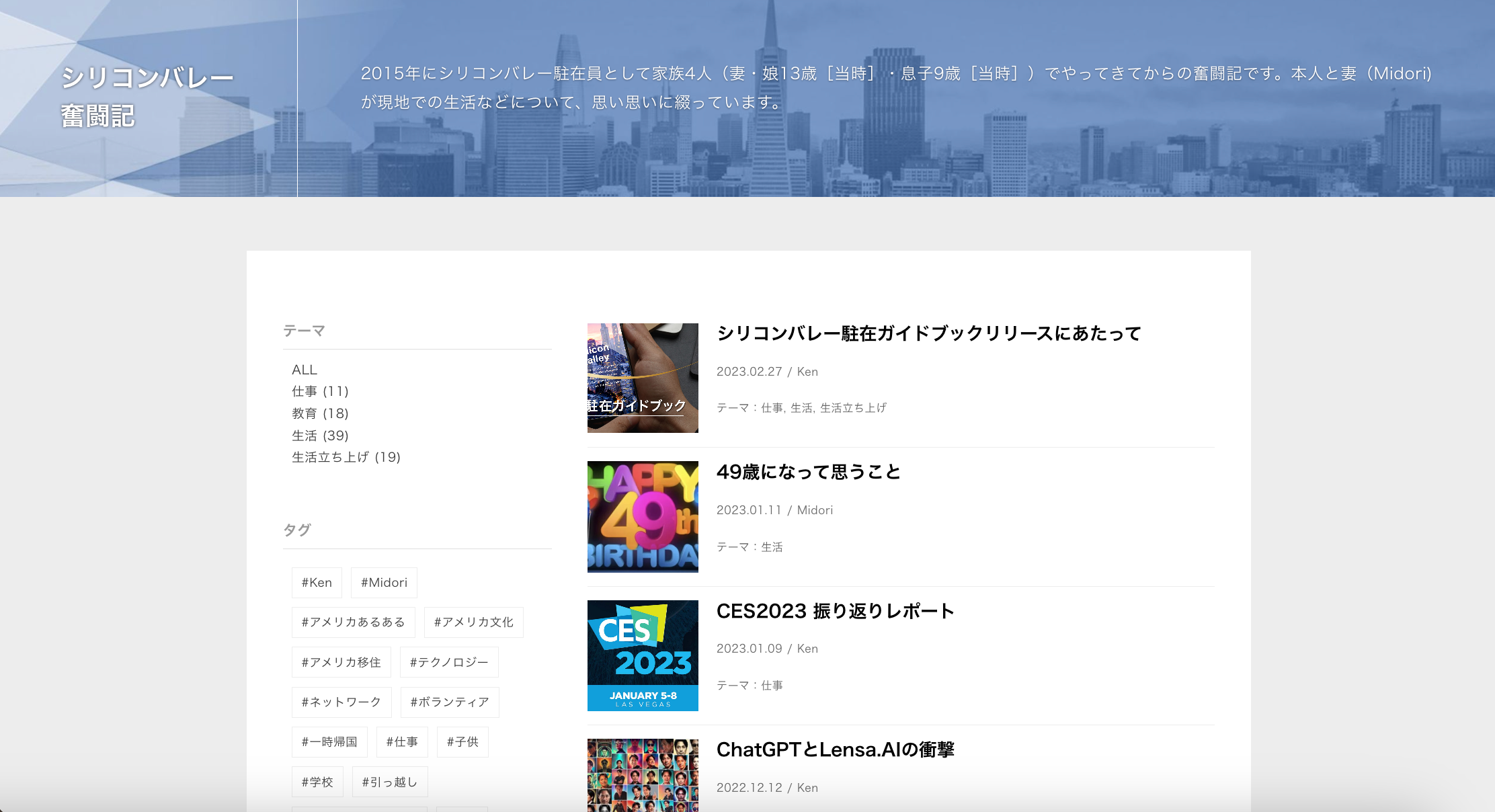 2015年にシリコンバレー駐在員として家族4人(妻・娘13歳[当時]・息子9歳[当時])でやってきてからの奮闘記です。本人と妻(Midori)が現地での生活などについて、思い思いに綴っています。