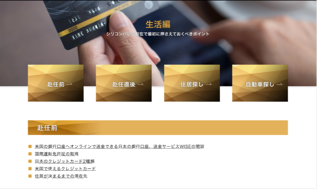 シリコンバレー赴任前から、赴任直後での生活立ち上げに必要な情報が掲載されています。生活の立ち上げには順序があるため、あらかじめやるべきことを整理しておくことが重要です。