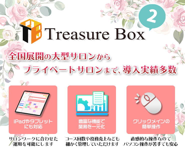 『TreasureBox2』はサロン向け最先端クラウド顧客管理システムです。