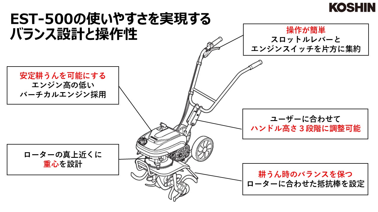 初めての方にもラクに使っていただけて、簡単なのにパワフルな耕うん機(EST-500)、乗用車に搭載可能で軽トラを持たない方でも気軽に耕うん機を使用できます。2025年2月21日(金)発売開始