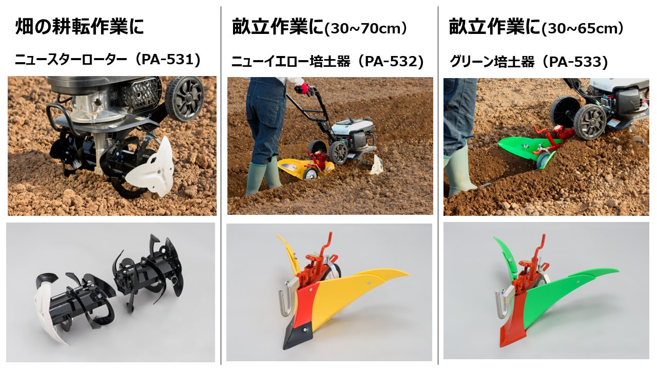 各種アタッチメントを取り付けることで、耕うん以外にも畝立・培土作業に対応可能です。