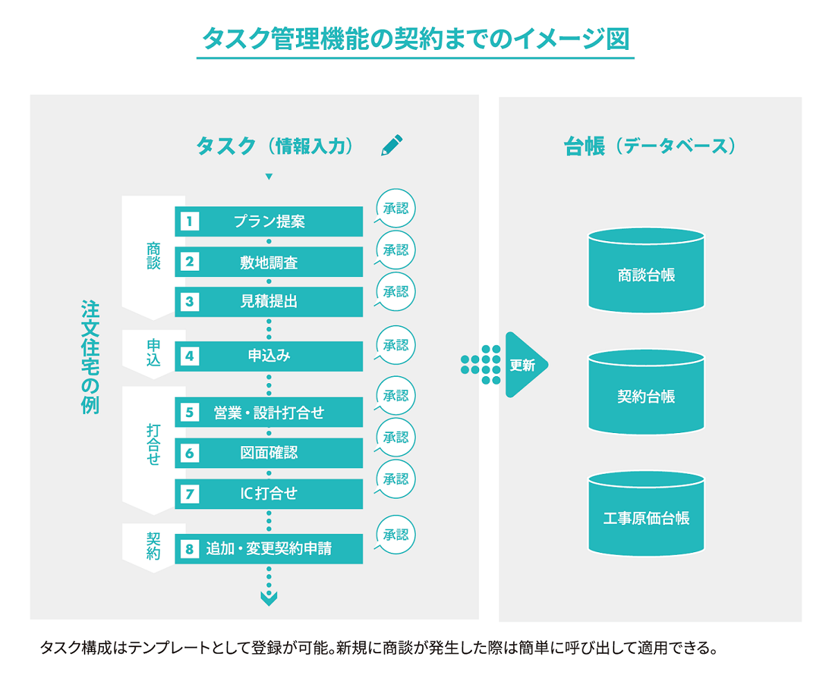 新たに搭載された「タスク管理」機能は、自社のワークフローと入力項目を定義することで、業務を標準化し、進捗を見える化します。画面の指示に従って情報登録を進めるだけで、必要な情報が漏れなく蓄積されます。また、各タスクは申請/承認により統制でき、ガバナンスの下で正確な業務の進行を確保できます。