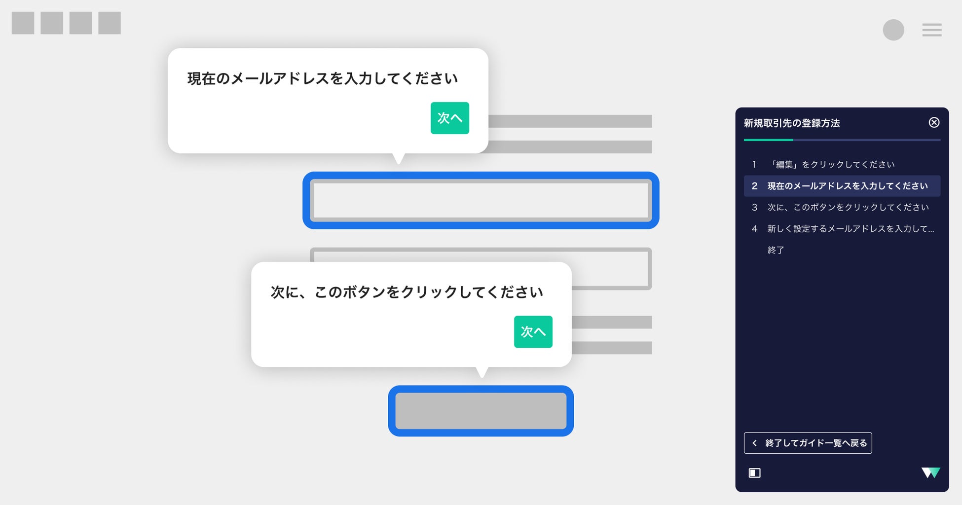 - 各ツールの利用用途に合わせて、リアルタイムに入力・操作をサポートするガイドを表示します。ノーコードで直感的にガイドの表示・作成・共有ができます。