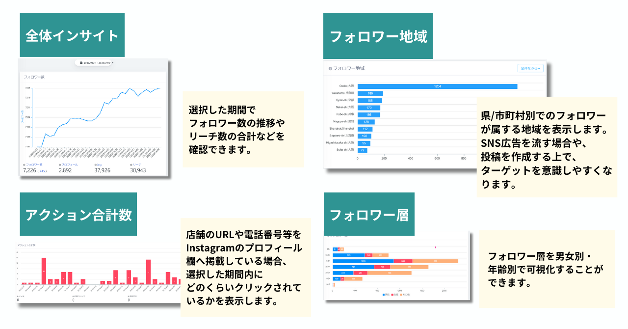 Instagram分析だけではなく、業務効率の改善やGoogleビジネスプロフィールとの連携もできるため、ツール一つでお客様のInstagram運用に役立つ機能やサポートを備えております。
