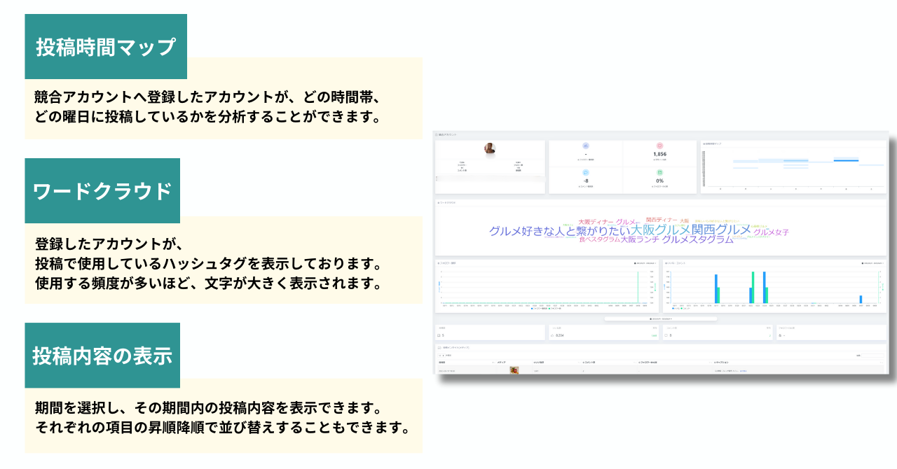 登録した競合アカウントの平均投稿時間帯や、使用しているハッシュタグなどを確認することで、運用方法の参考として活用できます。