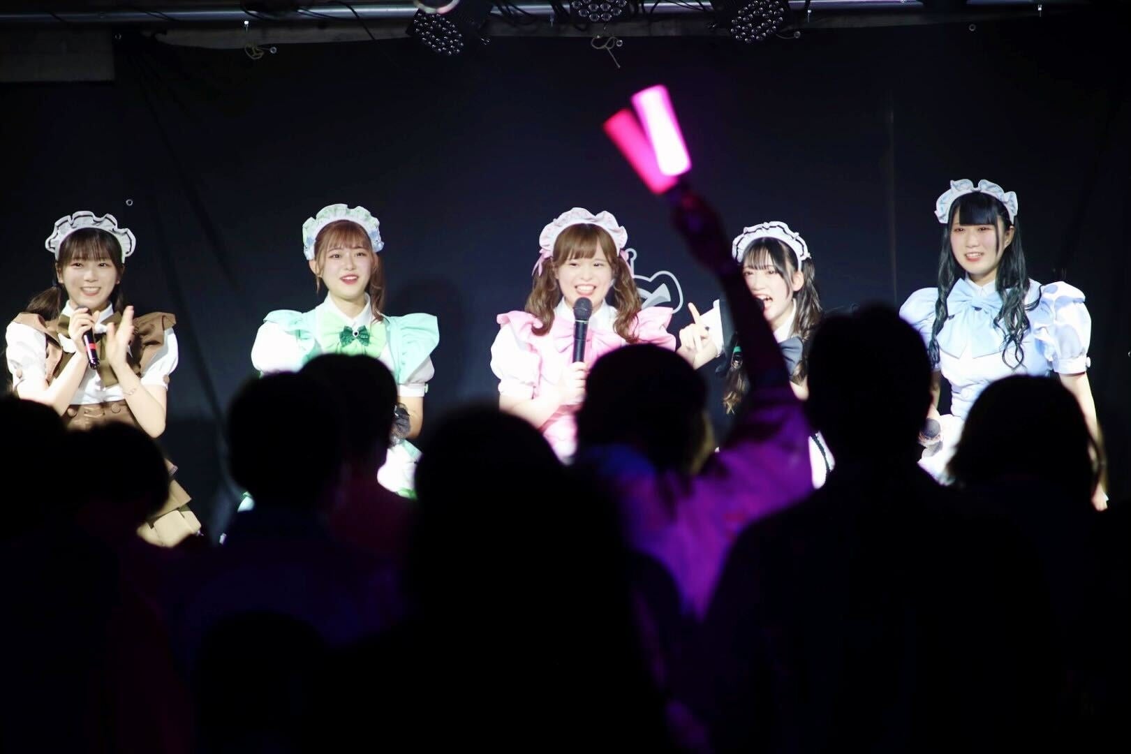 今回のライブに出演したのは、こむぎ、あんな、なな、ゆらり、れあ、の5人の人気キャスト。幕開けから店舗オリジナル曲「First maid~はじまりのうた~」「Perfect Maid Days」の2曲を続けて披露し、場をあたためる。