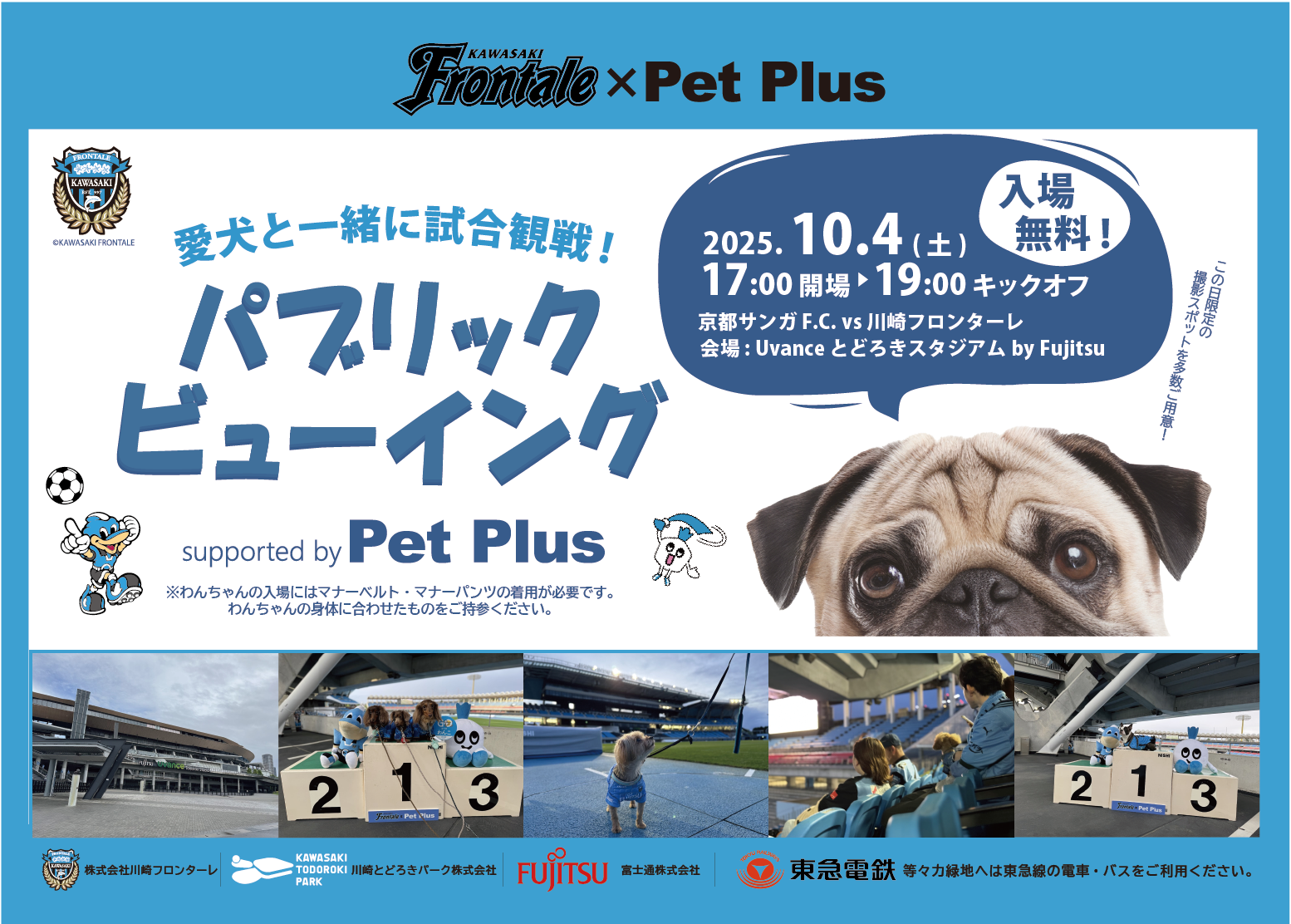 「パブリックビューイング supported by Pet Plus」は、ワンちゃんと一緒にフロンターレを応援する楽しさに加え、みんなが安心して過ごせるペットフレンドリーな社会を目指したマナー啓発の場でもあります。