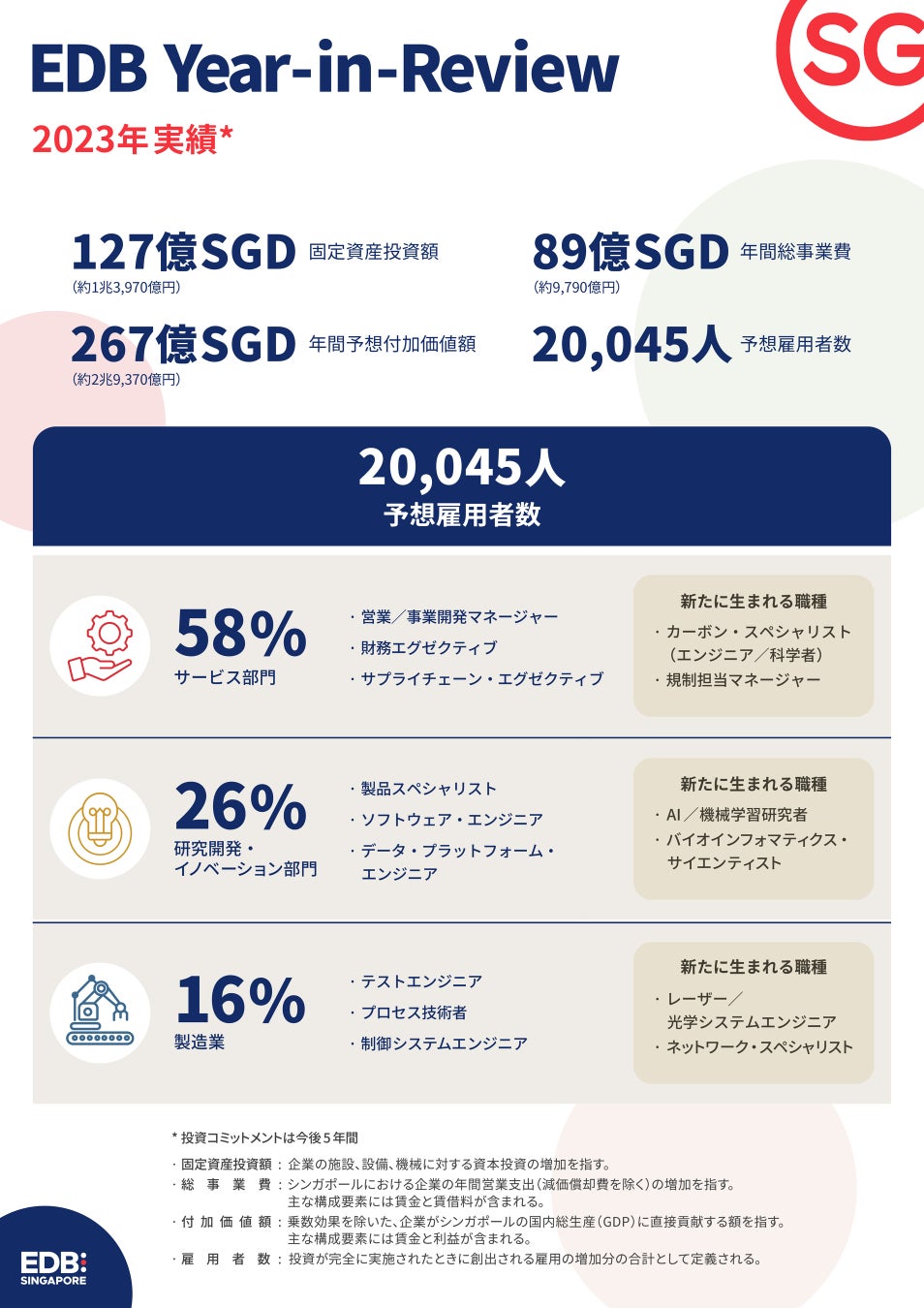 投資履行後に見込まれる20,045人の雇用については、58%がサービス、26%が研究開発・イノベーション、残りの16%が製造業となっています。