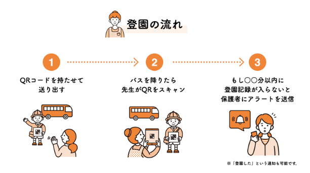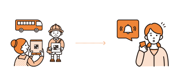 2. 通園バスを降りたら先生がQRコードをスマホ・タブレットのカメラでスキャンします。このスキャンによって登園が記録(チェックイン)されます。