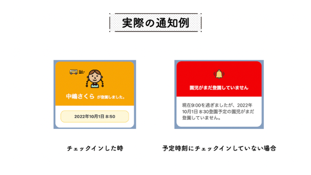 3. 園児がチェックインすると、登園したことが保護者にLINEで通知が送信されます。また、最初に登録した登園予定時刻から一定時間が過ぎてもチェックインしていない場合には「まだ登園していない」という旨の通知がLINEで送信されます。