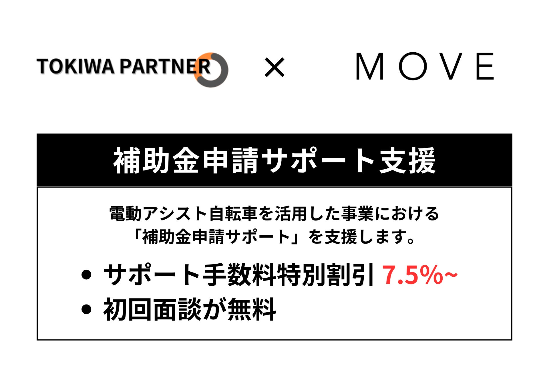 MOVE株式会社(本社:東京都中野区、代表取締役:冨田 大揮)は、日本発の電動自転車ブランド「MOVE.eBike」を運営し、電動自転車業界におけるエコフレンドリーな移動手段としての発展と、スマートモビリティ社会の実現を目指しています。この目標を実現するため、Tokiwa Partnerがもつ公的補助金に関する知見と豊富なビジネス経験を活かして、中小企業による革新的な製品・サービスの開発支援を強化します。