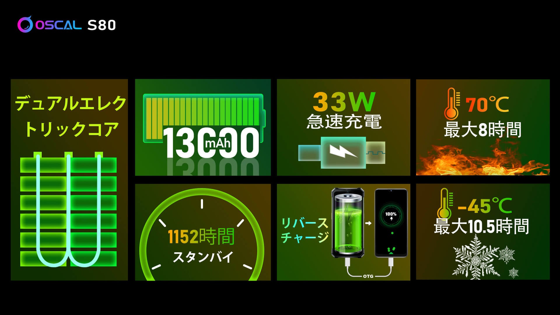 Oscal S80は33W急速充電が可能な13,000mAhバッテリーを搭載し、48日間の連続待受が可能です。