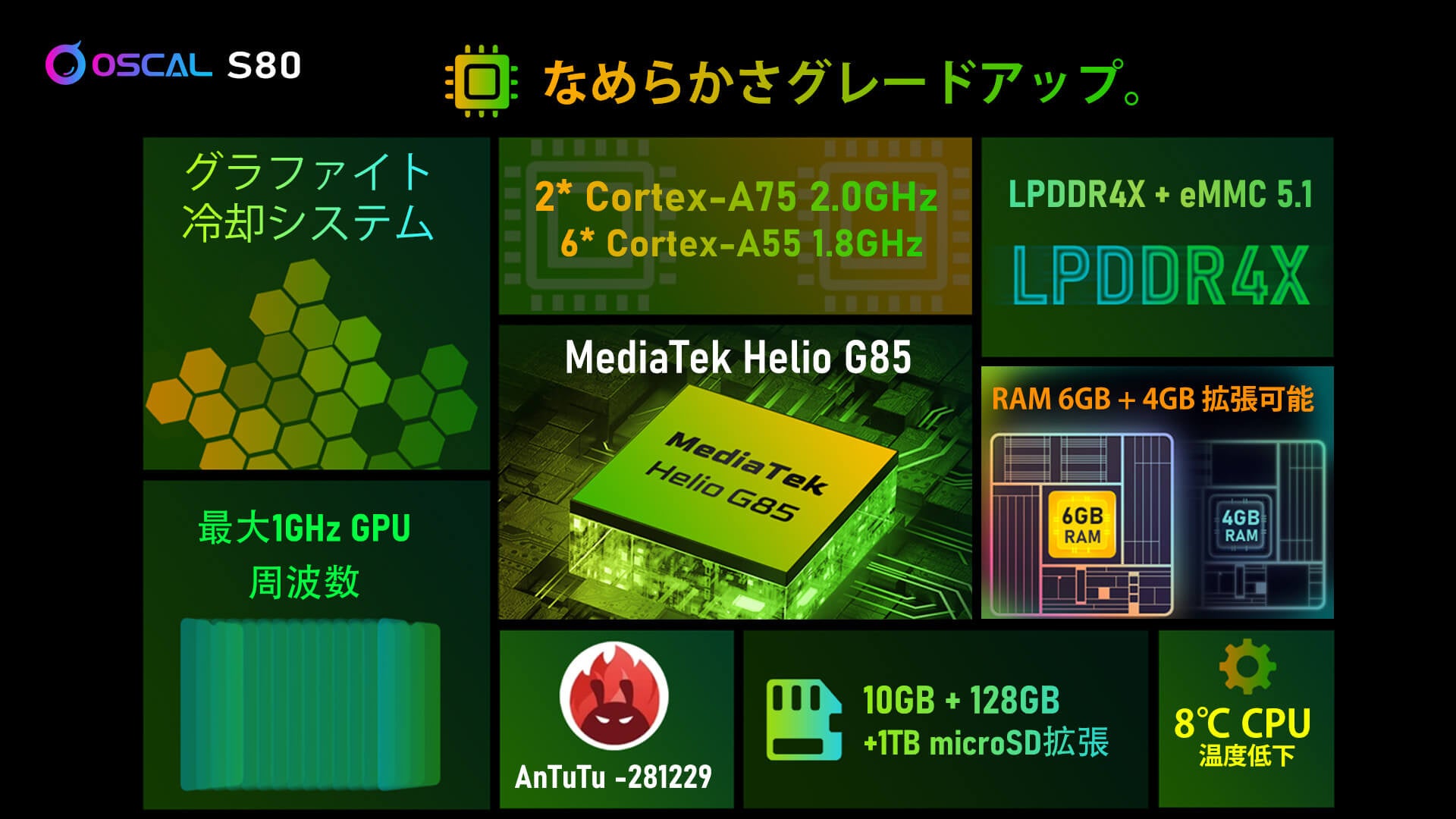 ワンタッチですべてが変わる- MediaTek Helio G85 +6GBメモリ+4GB仮想メモリ + 最大128GBストレージ+SDカードで最大1TBで拡張可能