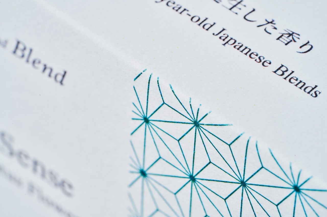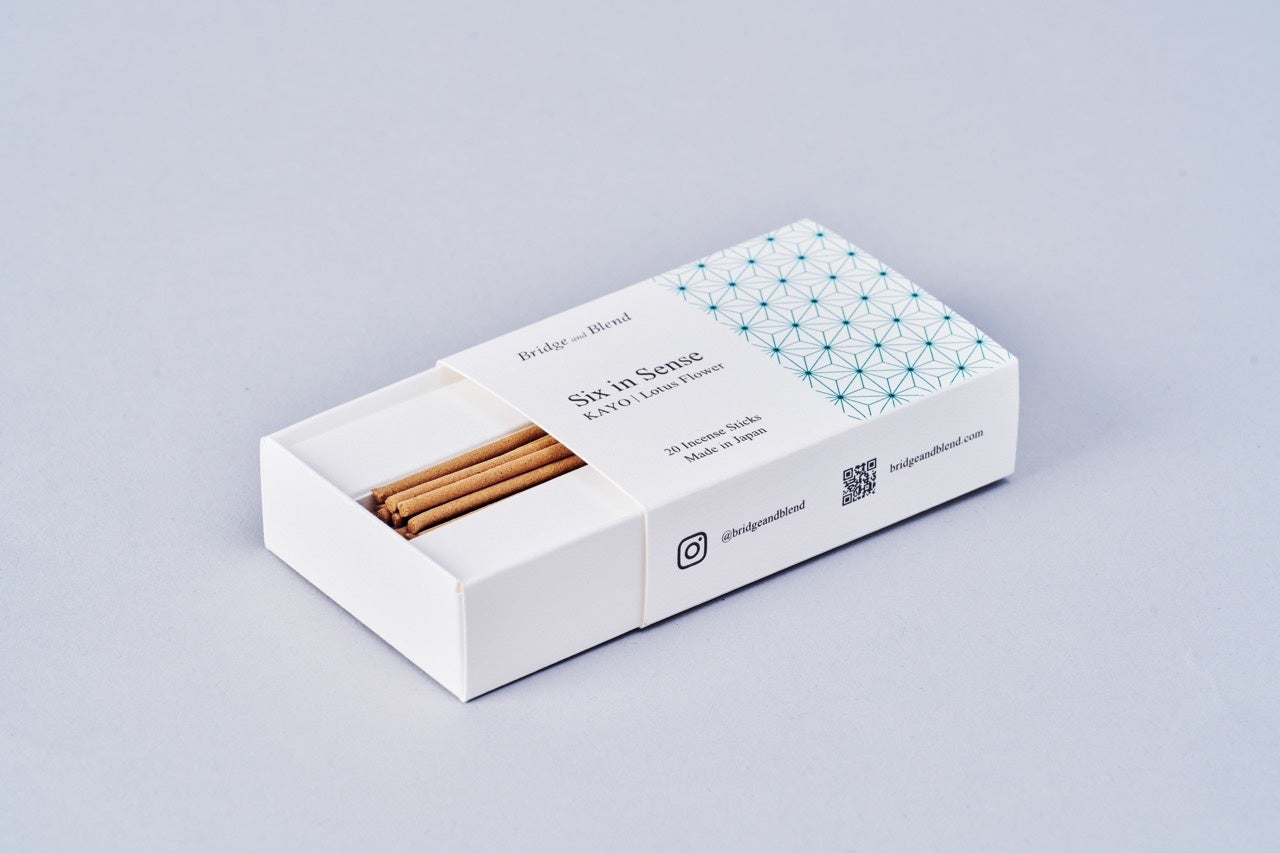 パッケージデザインには古代紋様の麻の葉を起用。この紋様にはBridge and Blend「Six in Sense」のコーンタイプのお香をモチーフにした三角形と、この度リリースしたスティックタイプのお香の直線が隠れており、俯瞰的に眺めると6つの香りを意図する六角形が浮き上がって見えます。