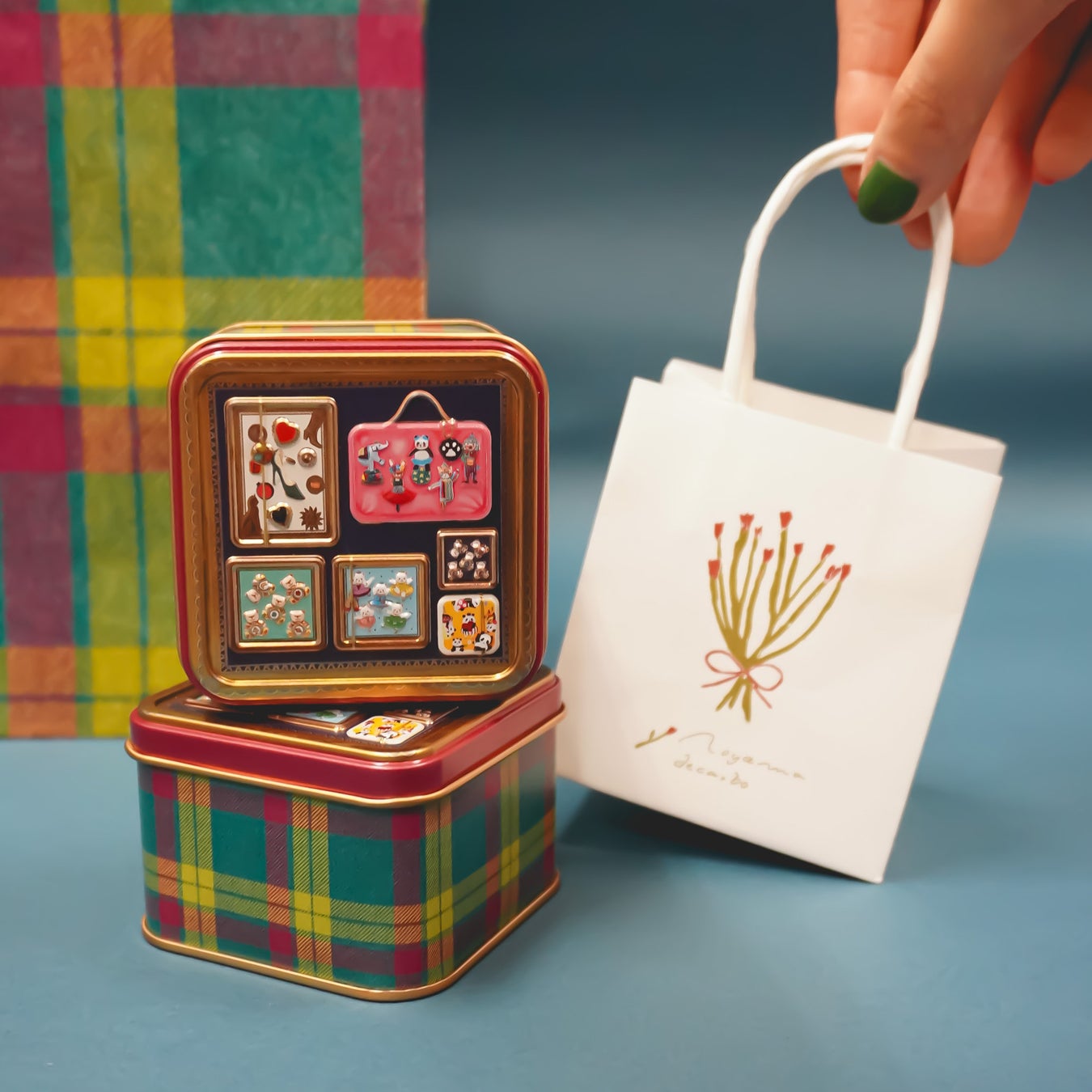 缶の本体は、伊勢丹のタータンである「マクミラン/イセタン」を、缶の蓋(側面)に使用したエンジは、三色あるタータンの色の内の一つを表現しました。