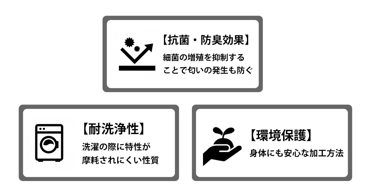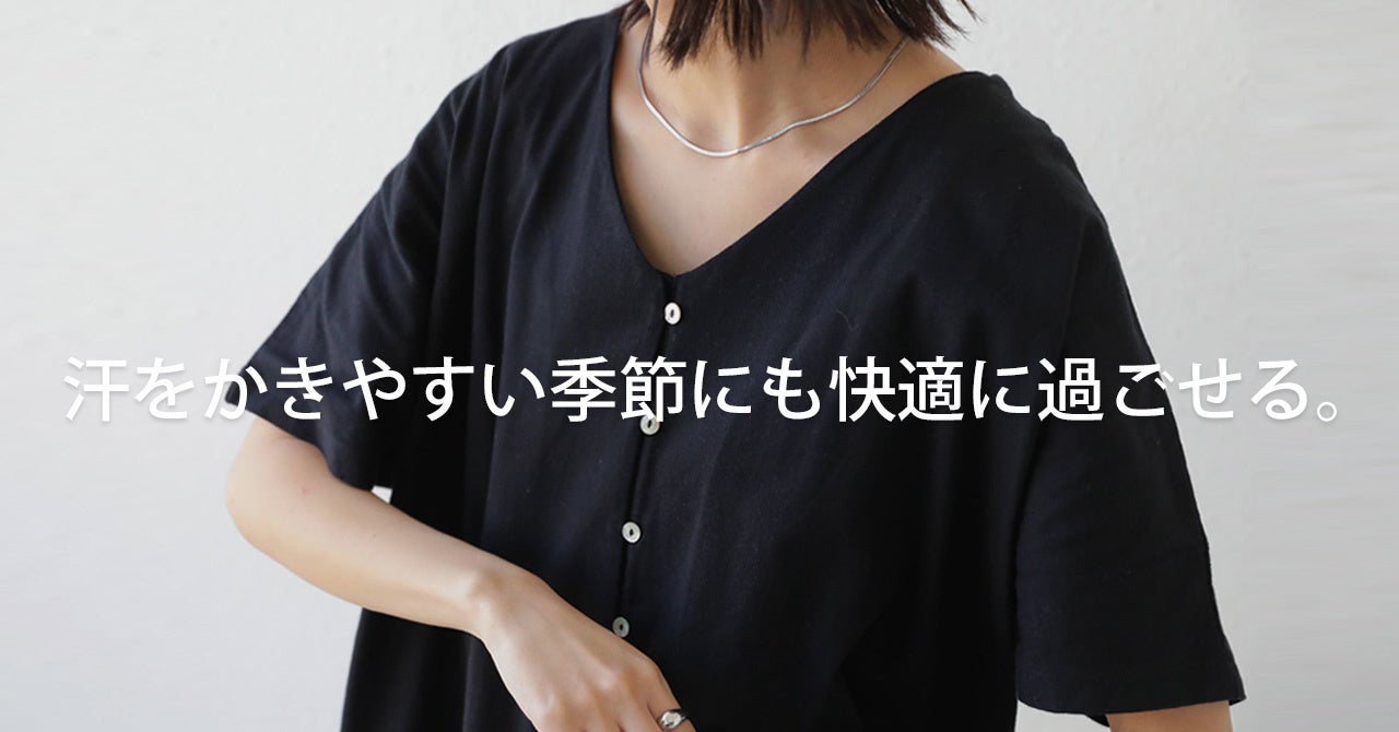 においの原因となる黄色ブドウ球菌などの細菌を増殖を抑制することで汗や生乾きの【嫌な臭い】を発生させないようにする抗菌防臭加工を施しております。汗をかいても臭いが気になりにくく夏に外せない嬉しいポイント♪