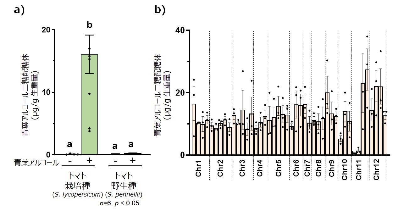 私たちが主に食用しているトマト栽培種S. lycopersicumとトマト野生種17種が香り物質から青葉アルコール二糖配糖体を作るかを調査しました。その結果、トマト栽培種と多くのトマト野生種が青葉アルコール二糖配糖体を作ることがわかりました。しかし、青葉アルコール二糖配糖体をほとんど作らないトマト野生種 (Solanum pennellii: ソラナム ペネリ)※9があることがわかりました (図2a)。そこで、私たちは青葉アルコール二糖配糖体を作るトマト栽培種S. lycopersicumと作らないトマト野生種S. pennelliiの遺伝子を比較することで、青葉アルコール二糖配糖体を生む出す酵素遺伝子を同定できると考えました。トマト栽培種S. lycopersicumの遺伝的背景を持ち、染色体の一部のみがトマト野生種S. pennelliiに置換された染色体断片置換系統 (introgression lines: IL)※10が開発されており、有用遺伝子の探索や同定などに使用されています。私たちは、トマト栽培種S. lycopersicumとトマト野生種S. pennelliiの染色体断片置換系統のうち、44系統を用いて青葉アルコール二糖配糖体を測定しました。その結果、トマト栽培種S. lycopersicumの11番目の染色体の一部が、トマト野生種S. pennelliiの染色体の一部と置換したIL11-1およびIL11-2において、青葉アルコール二糖配糖体が減っていました (図2b)。