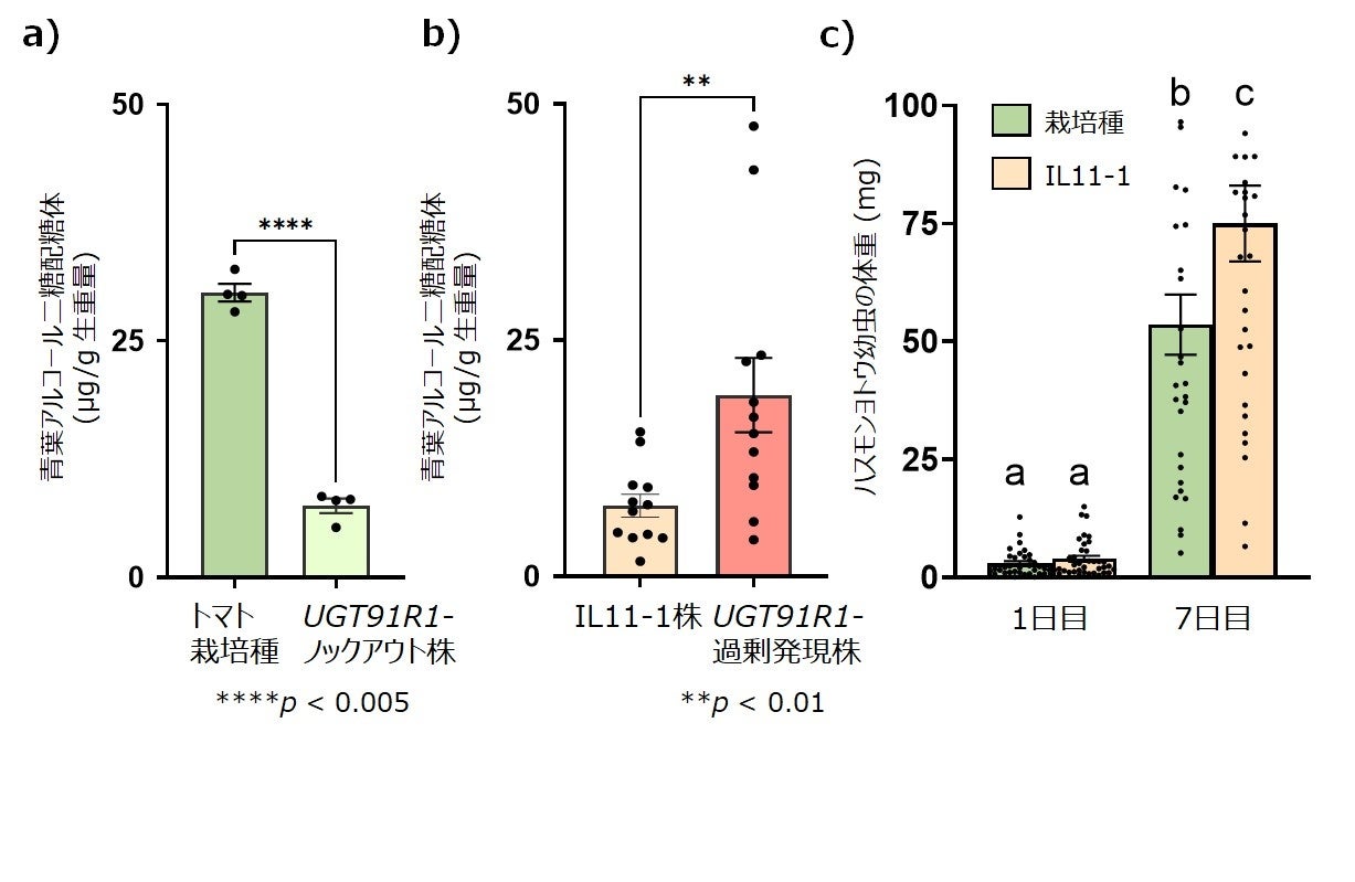 UGT91R1がトマト株で働いているかを調べるために、ゲノム編集技術を用いてUGT91R1遺伝子を欠失させた遺伝子欠損変異株 (UGT91R1-ノックアウト株) と、UGT91R1遺伝子を過剰に発現させた過剰発現株 (UGT91R1-過剰発現株) を作製しました。これらUGT91R1-ノックアウト株とUGT91R1-過剰発現株に含まれる青葉アルコール二糖配糖体を測定しました。その結果、UGT91R1-ノックアウト株では青葉アルコール二糖配糖体の内生量が25%に低下し、UGT91R1-過剰発現株では青葉アルコール二糖配糖体の内生量が3倍に増加しました (図4a, 4b)。さらに青葉アルコール二糖配糖体の内生量が減少している染色体断片置換系統IL11-1株を用いてハスモンヨトウ幼虫の食害試験行った結果、食害に対する抵抗性は低下しました (図4c)。以上の結果から、トマト株においてUGT91R1が青葉アルコール二糖配糖体を生み出す酵素として働いていることを明らかにしました。以上より、健全なトマト株は、トマト被害株から発散された青葉アルコールを取り込み、配糖化酵素UGT91R1によって防御物質である青葉アルコール二糖配糖体を生み出して、予め防御力を強化しておくことで将来起こり得る病害虫の被害から身を守ることを明らかにしました。