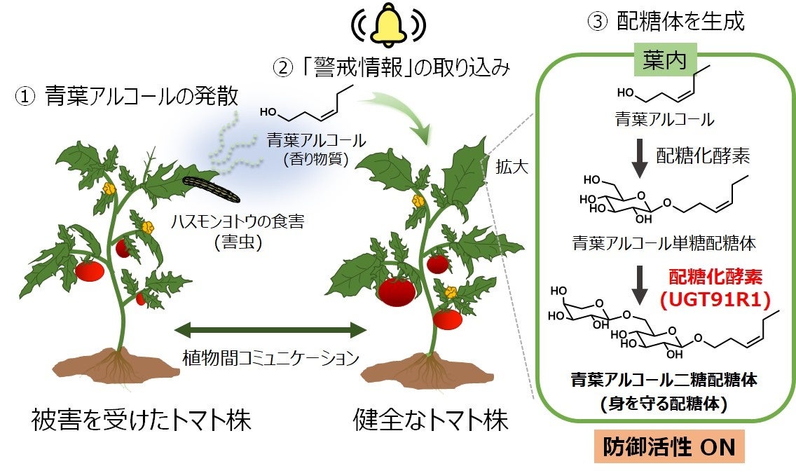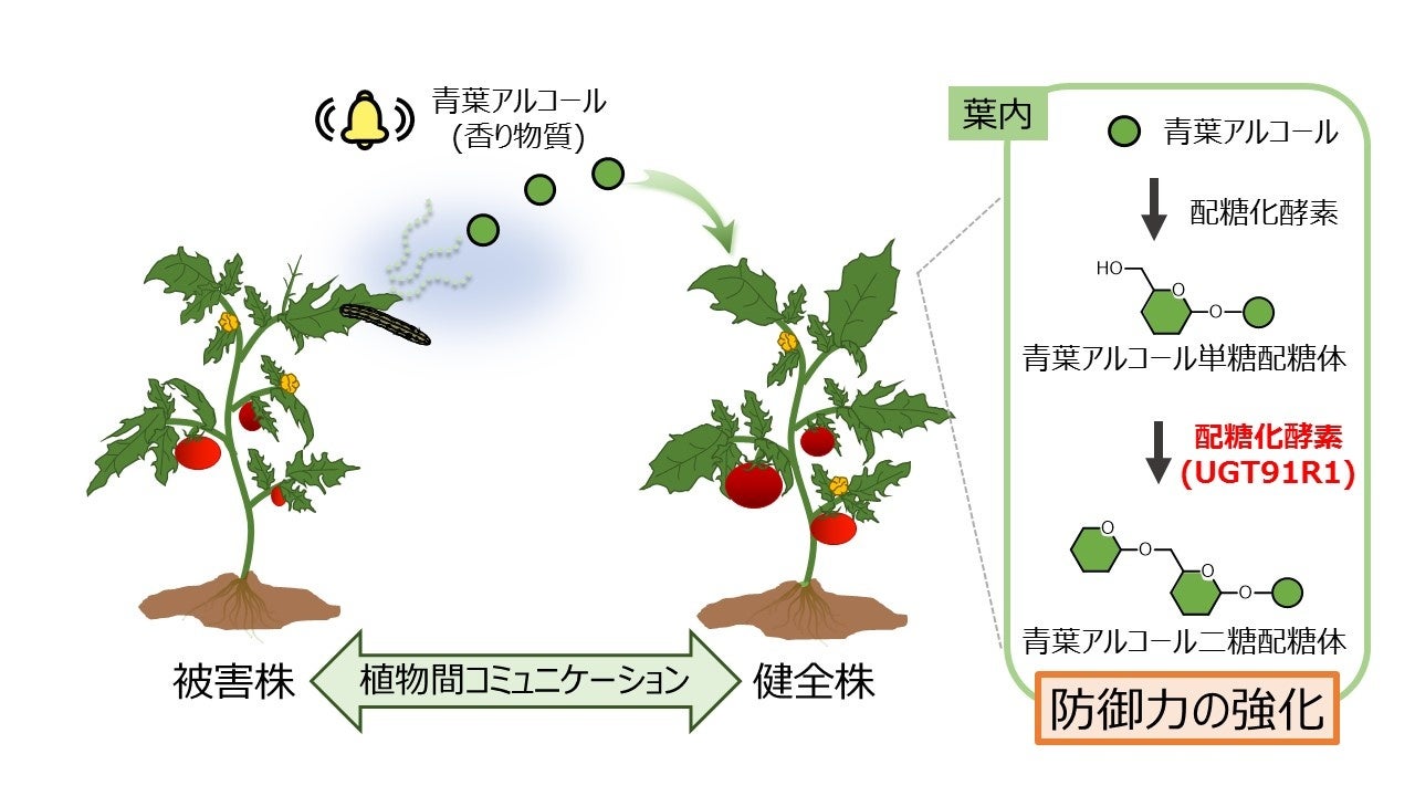 昆虫に食べられた植物は香り物質を発散します。被害を受けた植物から発散された香り物質は、危険を知らせる「警戒情報」として近くの健全な植物に取り込まれます。この香り物質 (警戒情報) を取り込んだ健全な植物は前もって防御を開始します (植物間コミュニケーション)※1。この受容から防御にいたる機構の一つに、健全な植物が取り込んだ香り物質を配糖体※2に変換することがトマト株でわかっています。しかし、健全なトマト株が、「どのように」香り物質を配糖体に変換しているかは分かっていませんでした。私たちは、植物間コミュニケーションによって植物が身を守る仕組みを解明するために、香り物質を配糖体に変換する酵素の探索に取り組みました。その結果、身を守る配糖体を香り物質から生み出す酵素 (配糖化酵素※3: UGT91R1) を発見しました (図1)。このことは、動物の「鼻」に相当する器官がないにもかかわらず、トマト株は香り物質を通じて外部情報を受け取り、配糖化酵素の働きで植物自身の防御力を強化することを意味しています。