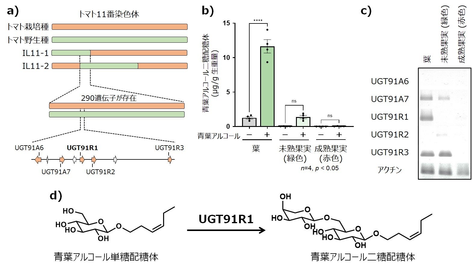 このことから、トマト栽培種S. lycopersicumとトマト野生種S. pennelliiの染色体が置換された遺伝子領域に、青葉アルコール二糖配糖体を生み出す配糖化酵素遺伝子があると予想して、IL11-1とIL11-2の染色体が置換した遺伝子領域を調べたところ、290遺伝子が存在しており、そのなかに配糖化酵素の一つであるウリジン二リン酸依存性糖転移酵素 (UGT)※11をコードする5つUGT遺伝子 (UGT91A6, A7, R1, R2, R3) を見出しました (図3a)。トマト栽培種S. lycopersicumは、青葉アルコール二糖配糖体を葉に貯めます(図3b)。また、これら5つのUGT遺伝子のうち、葉で最も発現量が高かったのはUGT91R1でした (図3c)。そこで、UGT91R1が青葉アルコール二糖配糖体を生み出す酵素かどうかを調査しました。大腸菌発現系※12を用いてUGT91R1組換え酵素を調製して、UGT91R1組換え酵素が青葉アルコール二糖配糖体を生み出すかどうかを調べたところ、UGT91R1は青葉アルコール単糖配糖体に糖を結合させて、青葉アルコール二糖配糖体に変換する配糖化酵素であることを明らかにしました (図3d)。