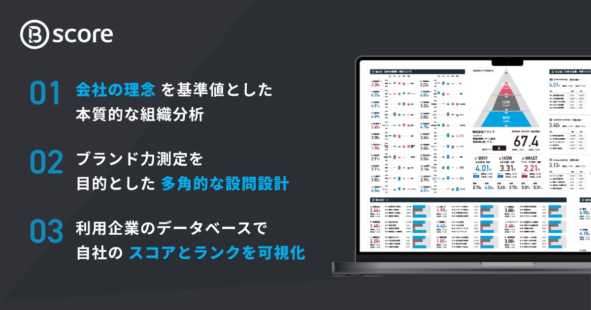 B-SCOREは企業のブランド力を可視化し、組織課題を把握・分析するためのブランドサーベイです。これまで可視化することが難しかったブランド力を、「理念・方針・行動」の3つの視点から、独自の設問とスコアリングにより数値化を実現します。B-SCOREを通して、組織改善や売上拡大に直結する強いブランドづくりをサポートします。