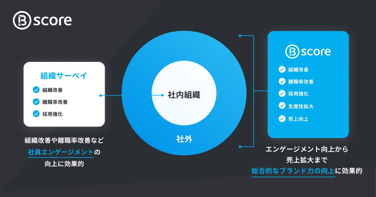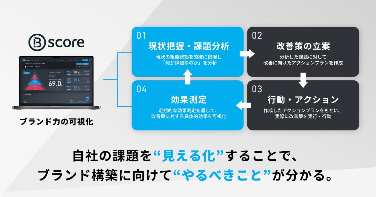 このような課題に対して、自社の組織状態を“見える化”し、課題の把握・分析から改善施策の立案、行動・アクションまでをサポートすることで、強いブランドづくりを支援することがB-SCOREの目的です。