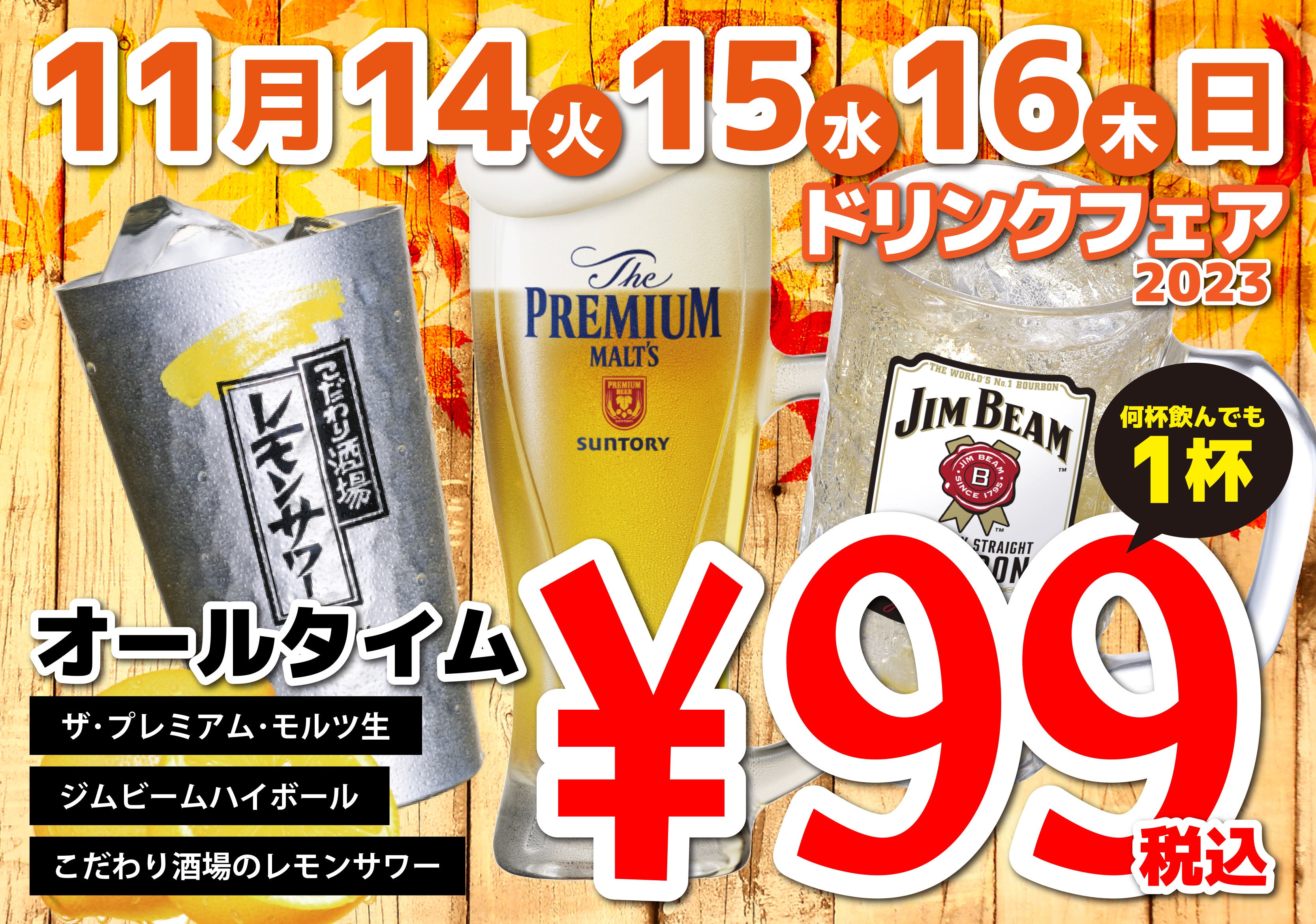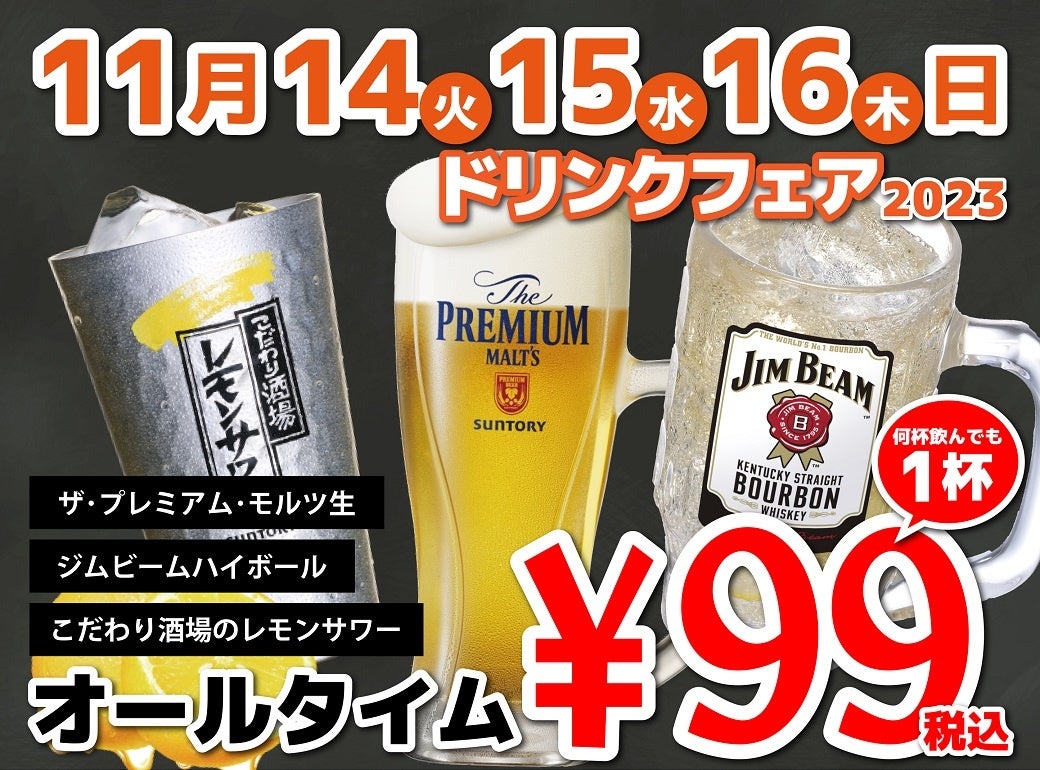 【プレミアムモルツ税込99円!!ラストチャンス!?】11月14日~16日に居酒屋一休深秋のドリンクフェア開催!!こだわり酒場のレモンサワー、ジムビームハイボールも99円!!