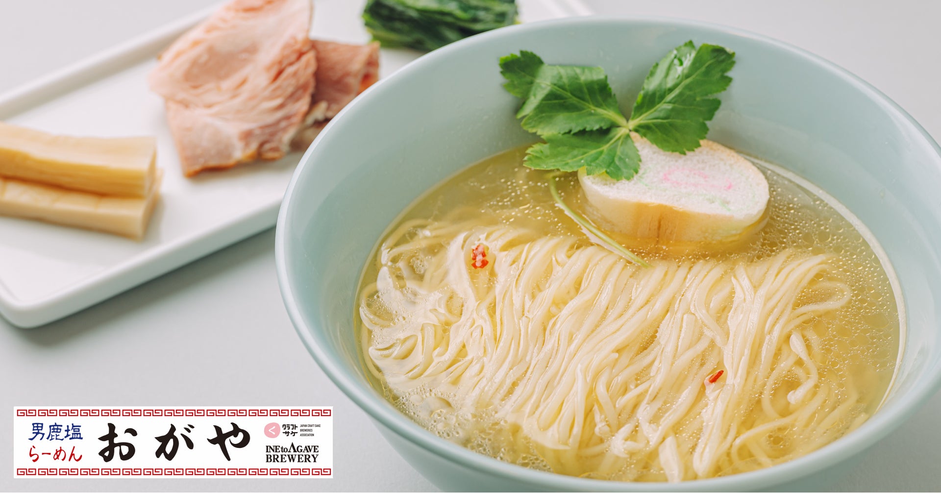 「おがや」のオリジナル看板メニューとして、「男鹿塩ラーメン」を共同開発しました。男鹿の名水・滝の頭の湧水で、秋田高原フードが育てたブランド鶏「高原比内地鶏」の鶏ガラともみじで丁寧に出汁を取り、芳醇な味わいの諸井醸造の十年熟仙しょっつると男鹿の塩を使用した塩ラーメンです。付け合わせは、稲とアガベの麹を使用した塩麹漬燻製チャーシューです。男鹿を中心とした食材の魅力が存分に詰まった「男鹿塩ラーメン」は、男鹿の魅力を味わっていただける一杯になっています。