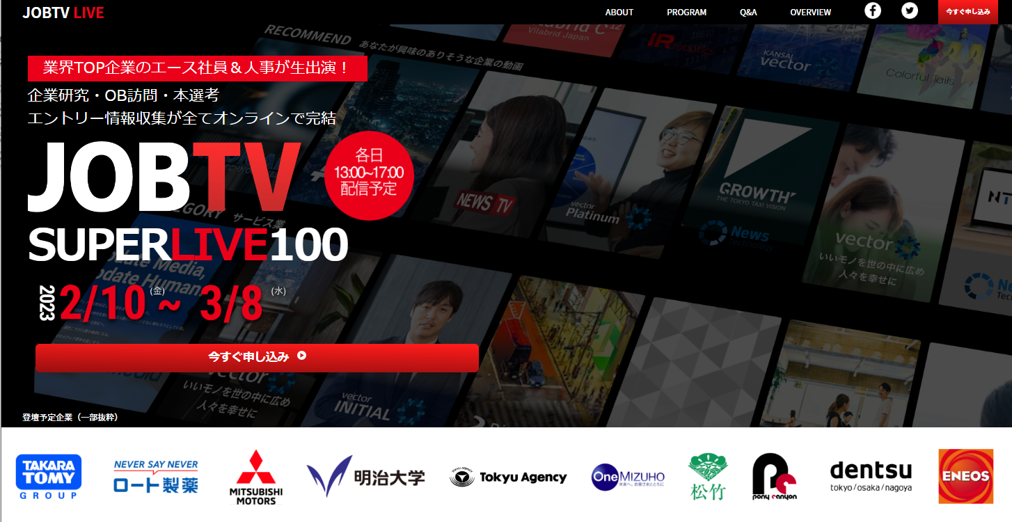 こうした実績を踏まえ、この度、JOBTV新卒では過去最大規模のライブ配信イベント「JOBTV SUPERLIVE100」を、本選考が最も活発化する2~3月の1か月間開催します。