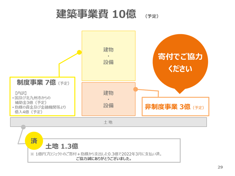 2022年3月には、全国の皆様からのご寄付により、金融機関から借り入れていた土地購入資金1億3,000万円を完済し、同年4月より施設建設に向けた寄付キャンペーンを開始しています。施設は2024年度の着工を目指しており、今年度中(2022年度)に3億円の寄付を募る寄付キャンペーンを行っています。