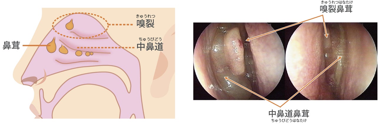 慢性副鼻腔炎(蓄膿症)のうち難治性の場合、ポリープ状の“できもの”が鼻の中にできるケースがあります。慢性副鼻腔炎の患者さんの10~20%に鼻茸があるといわれています。(i,ii)