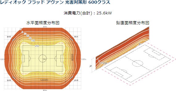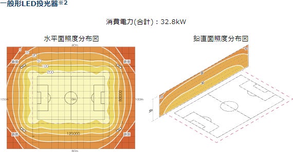 ※3 試算条件:サッカーコート被照明面積9,600m²(120m×80m)、照度200lx、均斉度≧0.5、グレア最大値≦50、器具台数44灯(照明柱4基 最下段33m)、水平面計算高さ0m、従来品保守率0.83、当該品保守率0.88