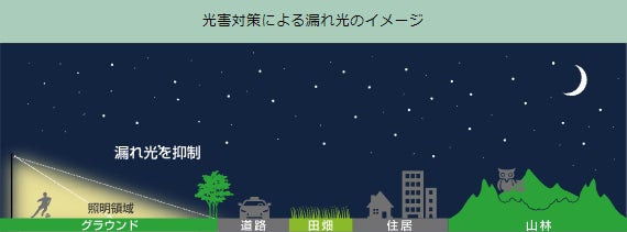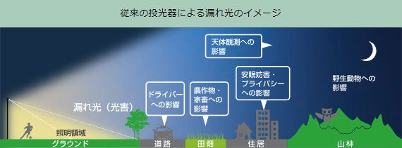 器具内蔵レンズ+反射板により、上方向への漏れ光を抑制した配光設計。 全配光タイプで、環境省策定の光害対策ガイドラインの「光環境類型 E1」の基準を達成。 施設周辺への漏れ光の影響を抑えます。