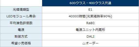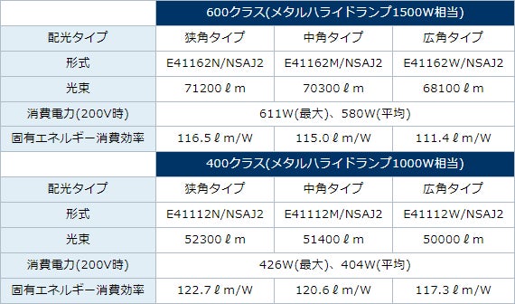 ラインアップはメタルハライドランプ1500W相当の明るさの600クラスとメタルハライドランプ1000W相当の400クラスの2種類。