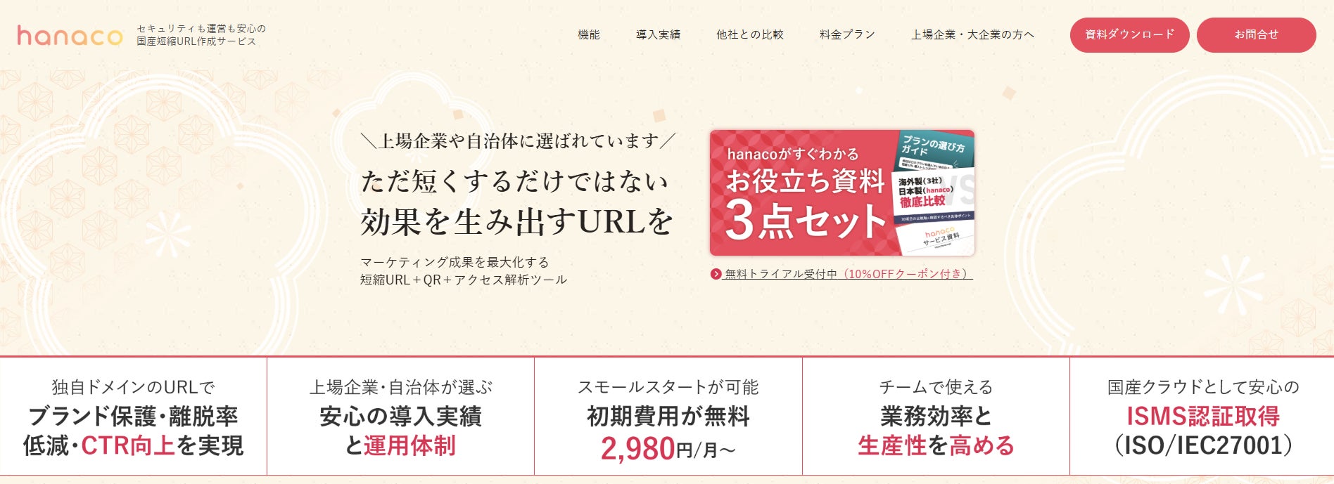 「hanaco Corporate Suite」は、短縮URL・QRコード・アクセス分析・API連携、管理画面(Console)を統合した、上場企業の内部統制・セキュリティ・運用ガバナンス要件に対応したURL管理基盤です。