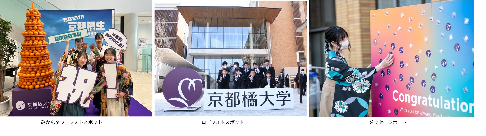 みかんタワー、京都橘大学ロゴのフォトスポットを設置します。みかんタワーのフォトスポットは2022年度の卒業式の際に初めて設置し、今回2回目となります。「未完の大学」という2022年度の本学のキャッチコピーを、本物のみかんを使用して、タワーオブジェをつくります。『大学生活では、今までとは違った世界や体験が待っていて、興味・関心の幅もさらに広がります。これからもっと学び、成長してほしい。未完は可能性である』という思いを込めたメッセージにしています。