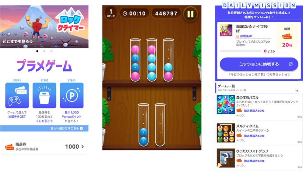 本サービスは、au/UQ mobile/povo/MVNO(au回線)をご利用のお客さまが「+メッセージ(プラスメッセ―ジ)」からアクセスできる「プラメゲーム」の公式アカウント、またはポータルサイト「プラメポータル」から利用でき、パズルやアクションなど8ジャンル150種類以上の定番ゲームが無料で遊べます。ゲームのスコアに応じてもらえる抽選券を集めると、抽選で最大1,000Pontaポイントがあたるくじを引くことができます。また、公式アカウントでは新着ゲームなどの情報に加え、フォロワー限定のゲームも配信します。