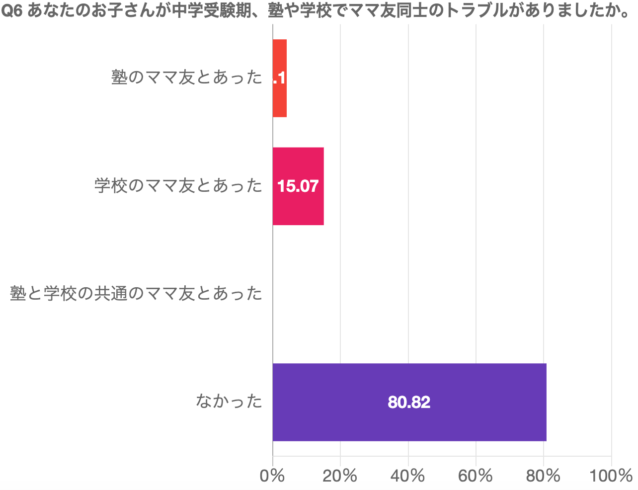 中学受験をした中高生の母親に受験期にママ友同士のトラブルがあったかと尋ねたところ、「なかった」という回答は80%を超えていました。