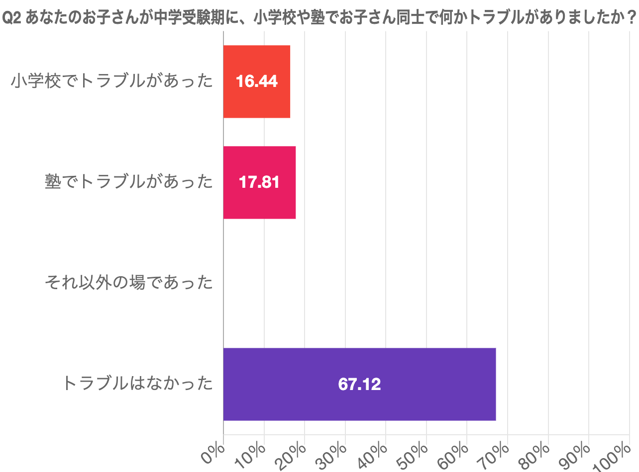 そのうち、塾でトラブルがあったのは、17.81%、小学校でトラブルがあったのは16.44%でした。トラブルがなかったと回答したのは67.12%でした。