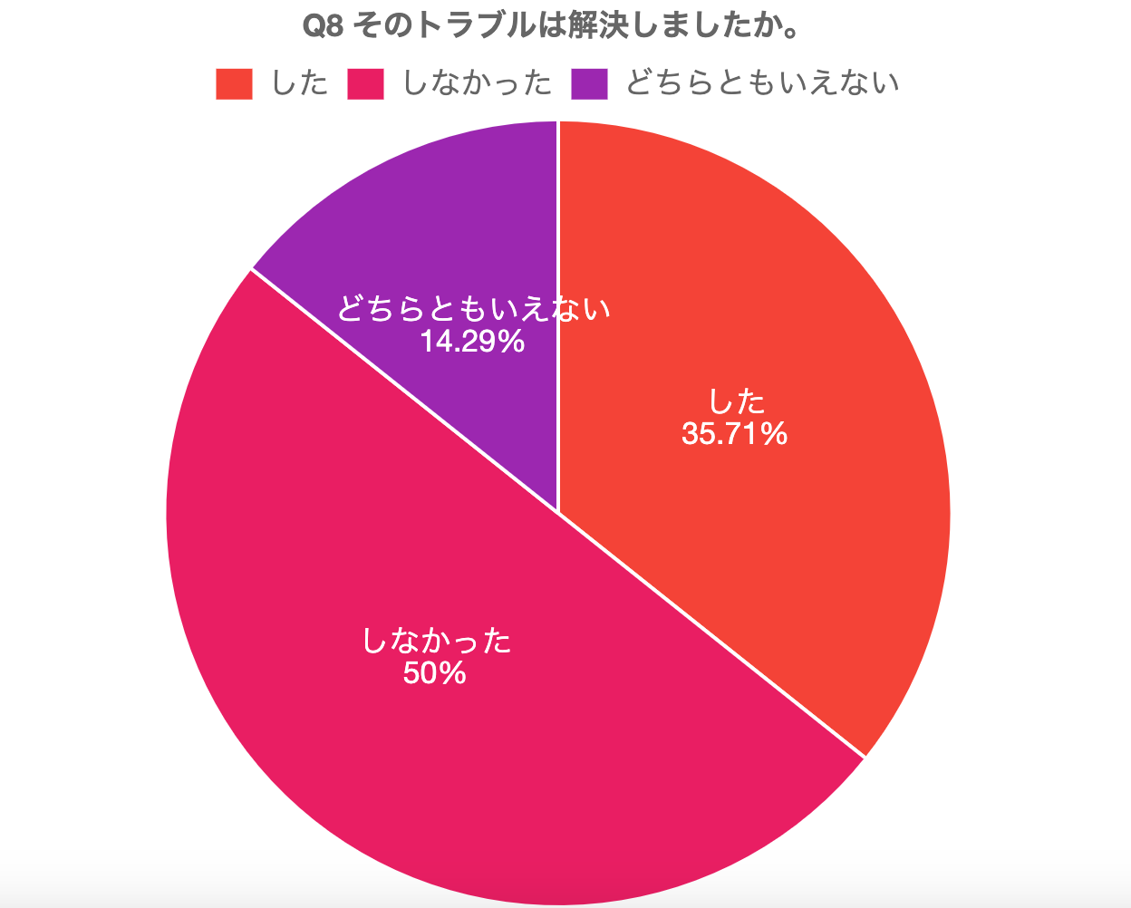 中学受験をした中高生の母親にママ友同士のトラブルが解決したかどうかについて尋ねたところ、「解決した」と回答した母親が35.71%、「解決しなかった」と回答した母親が50%でした。