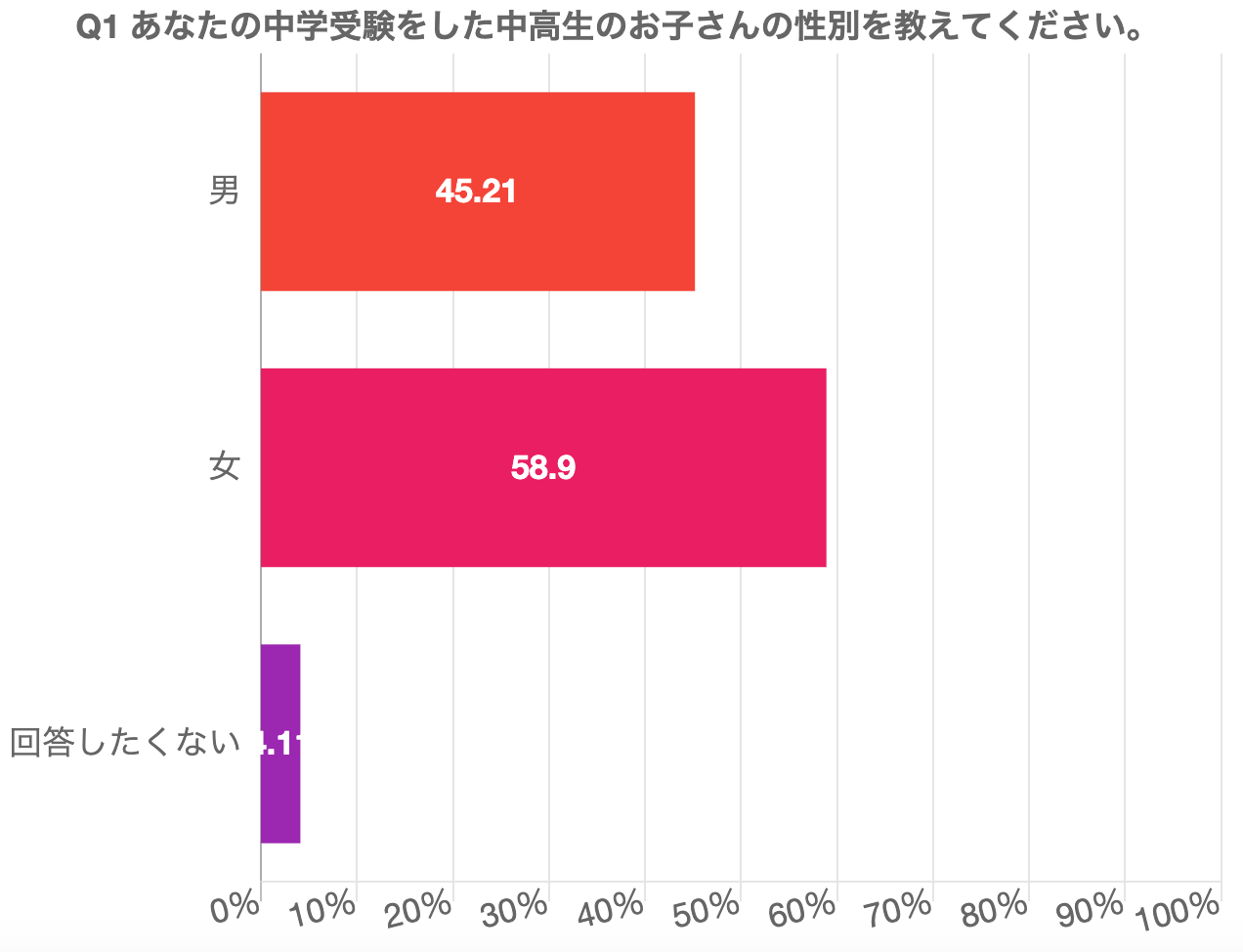 中学受験をした中高生の性別は男子45.21%、女子は58.9%でした。