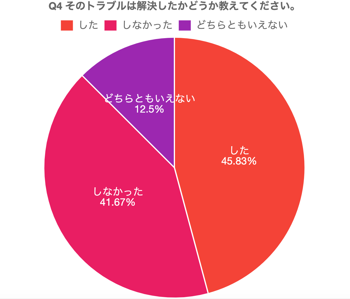 中学受験をした中高生の母親に子供同士のトラブルが解決したかどうかについて尋ねたところ、「解決した」と回答した母親が45.83%、「解決しなかった」と回答した母親が41.67%でした。