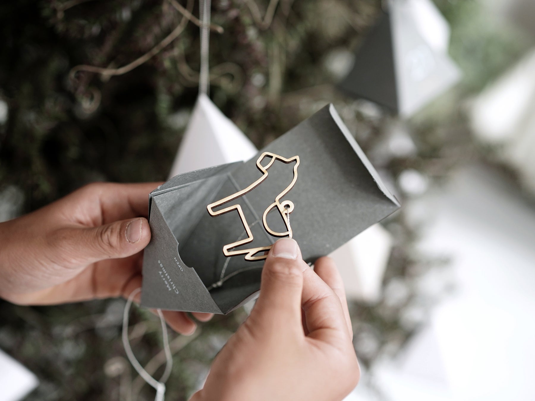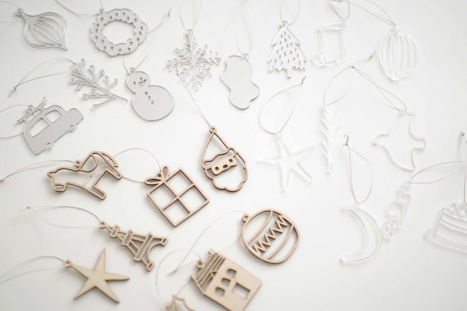 フォルネらしいやわらかい雰囲気の線画イラストを形にしたオーナメントは、透明アクリルとミラー、木製の3つの素材をMIXしています。
