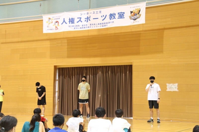 7月26日(火)スカイホール豊田にて「人権スポーツ教室」を開催し、#1中村太地選手、#4細谷将司選手、中堀純希アシスタントコーチ/スキルコーチが参加しました。