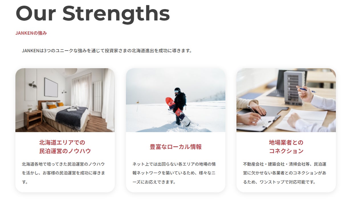 この3つの強みはいずれも、実際に事業を展開している土地に根付いている会社ならではの強みです。札幌に拠点を置き、北海道の広範囲に渡り民泊事業を展開している当社だからこそ、道内での投資に関するより高品質な情報を得て、提供することができます。