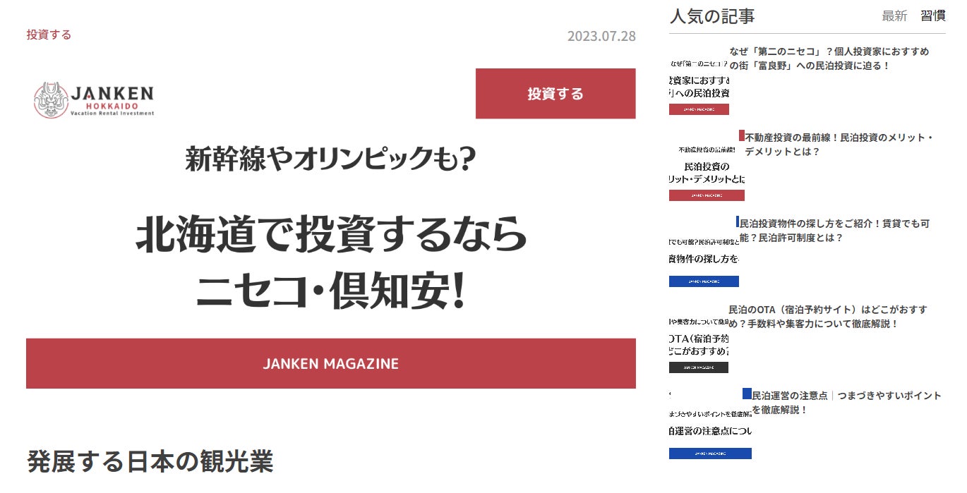 投資初心者の方や、この先北海道での投資を検討している方向けに、「JANKENマガジン」と題して、民泊投資に関する情報や北海道の投資先に関する情報を記事化して掲載しています。民泊投資の良い点だけでなく、デメリットとなるような点も含めて紹介していますので、よりリアルな情報を得ることができます。