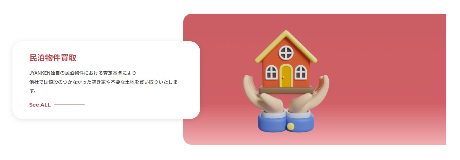 物件・土地の買取(https://worldwidebase.co.jp/service/fudousan/)も行っています。JANKEN独自の基準で買取を実施しますので、他社では値段のつかなかった物件・土地でも、お気軽にご相談ください。