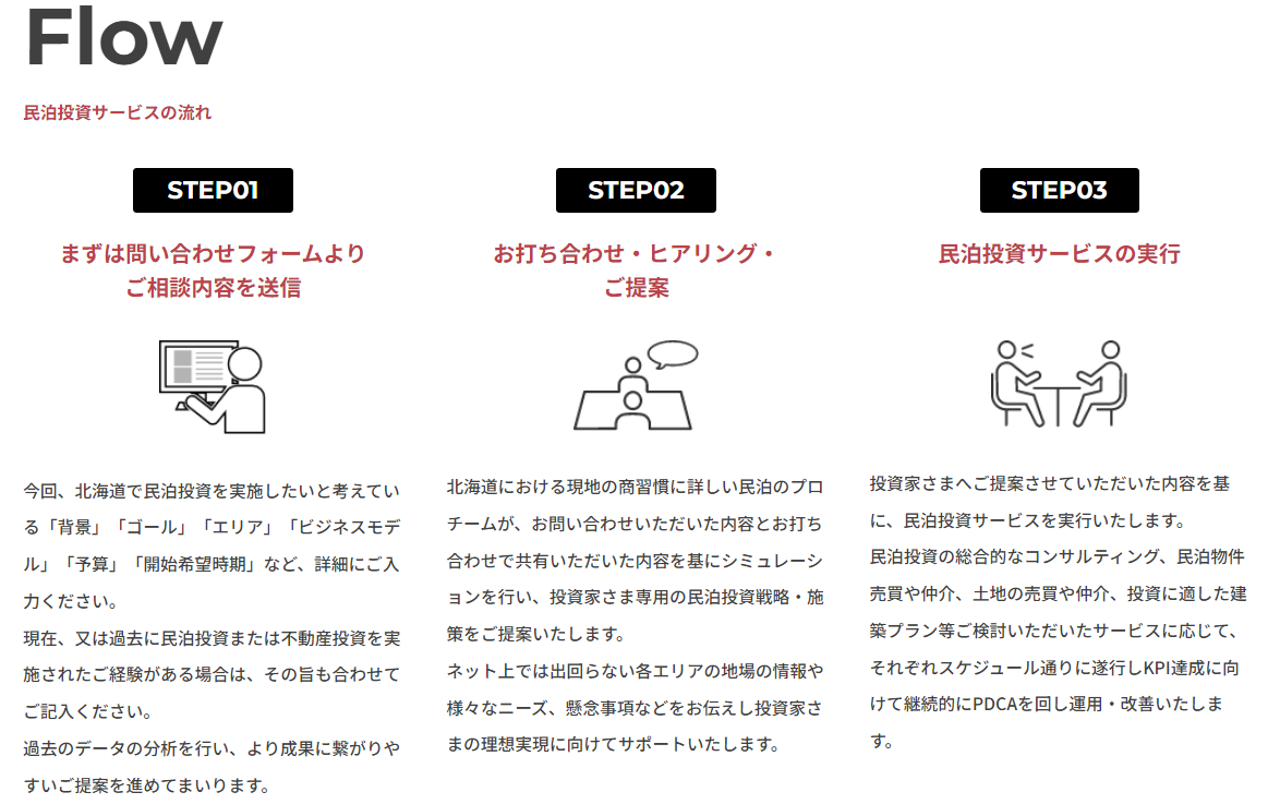 これまで当社が培ってきた民泊運営のノウハウや、北海道に拠点を持つ当社だからこそ得られたローカルな情報・つながりを活かして、投資家の皆様の北海道進出を成功に導きます。